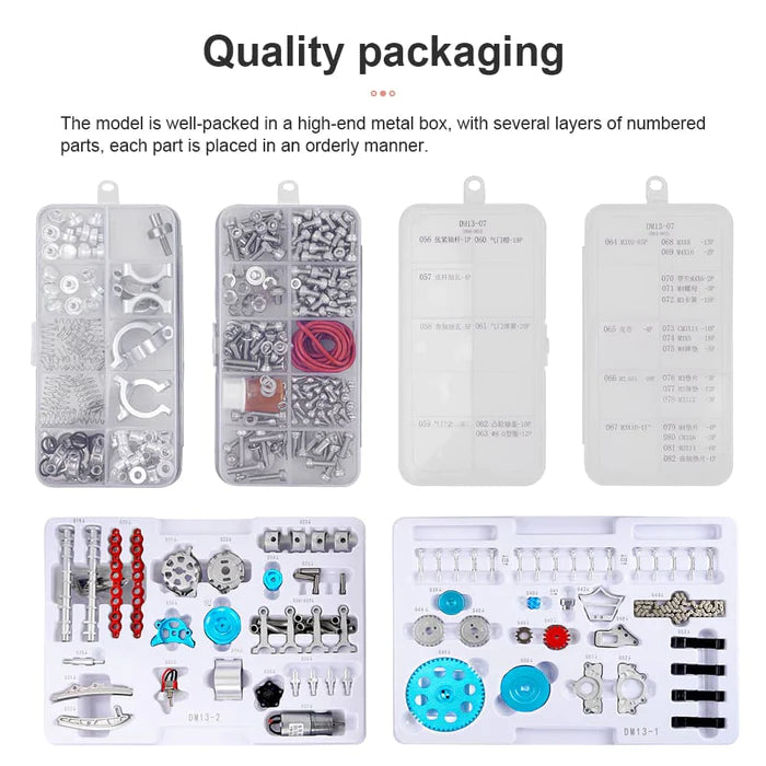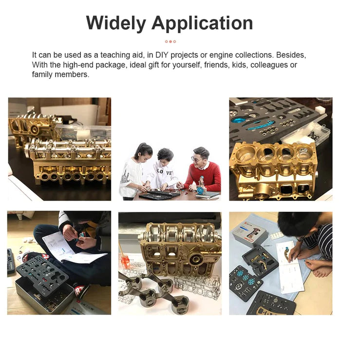 The engine is able to connect the power and run driven by the motor for increased reality and interest. You can observe the engine running process throughout the process. The model not only makes an exquisite ornamental model, also available as a simulated dynamic model that simulates the operation of a real engine. The whole process is as close as possible to the processes used in a professional engine assembly line.